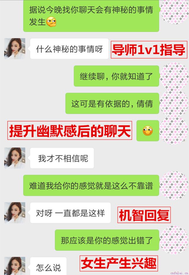 前面的聊天都是由咨询师一对一指导,所以学员没有出现一点问题,再加上提升了情商,幽默感之后,又可以和女生幽默有趣的开玩笑,刺激女生的情绪,破解女生顾虑。最终,女生答应学员一起手牵手散步的请求,这也意味着女生从心里面接受了学员是她的男朋友,学员也凭借着高情商的聊天,征服了女生,顺利发展成恋爱关系,并在结尾处互相调情,打情骂俏!