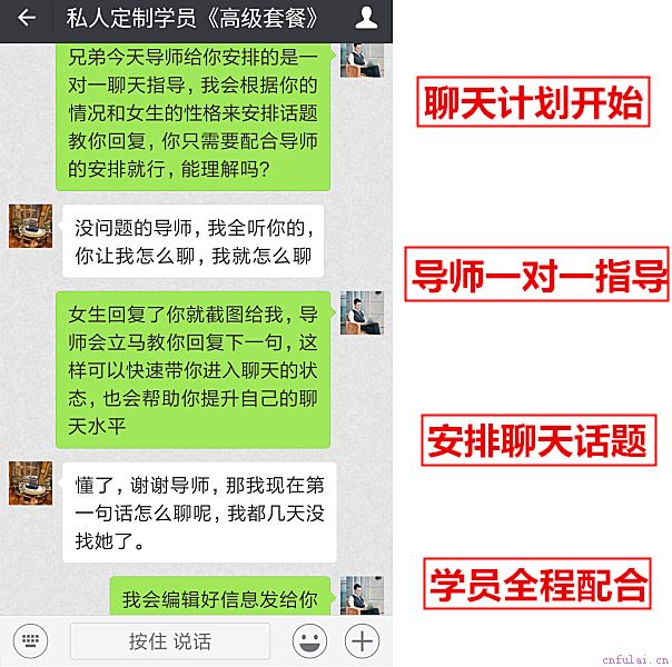然后,咨询师又教学员通过聊天来展示事业心,进一步让女生了解自己,同时获得女生的鼓励,这是女生认可学员的表现。只要女生肯聊,我们就有把握在女生面前充分展示自己,前提是你身上得有”吸引女生”的优点,只会按照聊天记录生搬硬套的话,肯定没有效果,因为你展示不了任何优点!