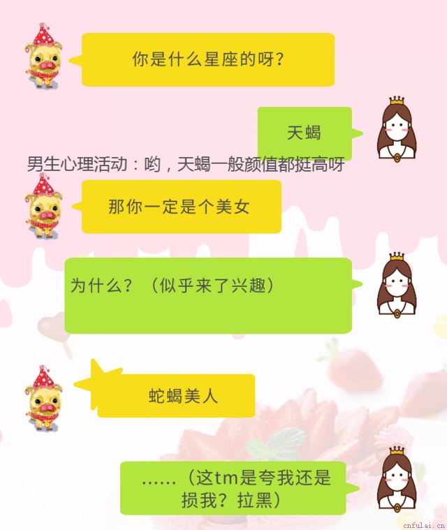 跟女生要怎么聊天?首先,告诉大家,100个男人当中,有90个男人不会聊天,所以不会聊天并不是什么丢人的事,你只是没有正确的方法和技巧。那么,不会聊天是一种什么样的体会?当一个不会聊天的人才开始和女生聊天的时候,他会想:都说女生对星座感兴趣,我先从星座下手吧就产生了这样的聊天截图: