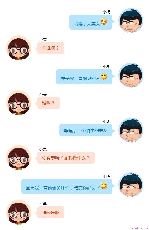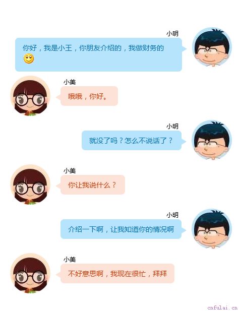 你是谁?干什么的?老家哪里?姓名关系到聊天的安全感和信任感,是交往的第一步;你的职业,代表着你的收入和文化程度;你的家乡反映着你的成长环境。除了上面这三个问题外,住哪里、和谁住、兴趣爱好等针对性的问题也要在交互阶段搞明白,毕竟我们不是为了聊天而聊天的,邀约才是目的,而这些都是判断邀约的条件。