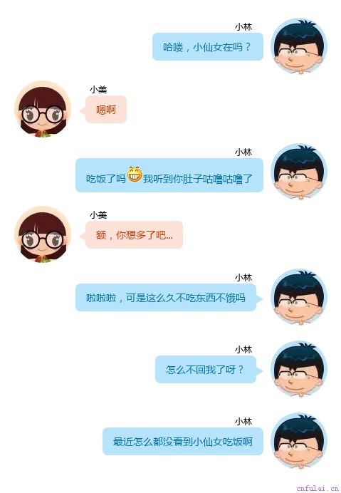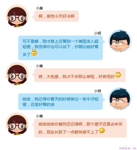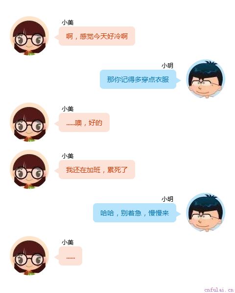 在如上例子中,男生已经完全把女生的话题当作问题来处理,从而迅速终结了这个话题。试问大家:一个女生冷了,不知道应该多穿衣服么?她感冒了,不知道多喝热水么?显然这个答案是否定的。那么,她跟你交流的目的其实是分享感受。而正确的聊天方式,是理解女生的感受,并延伸出更多话题。