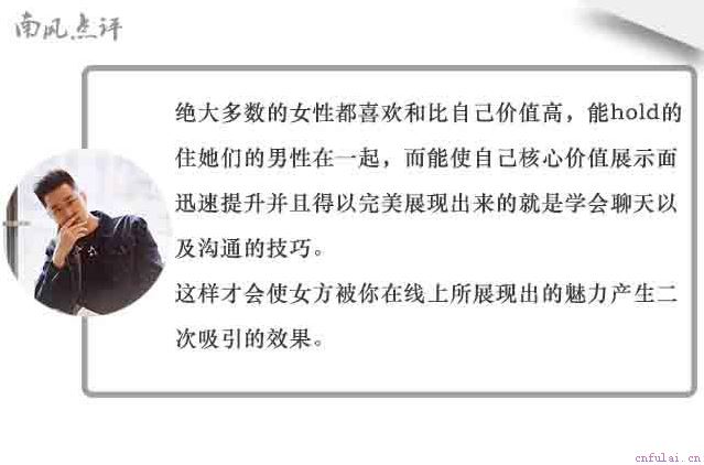南风点评:聊天中,尤其是追求过程之中最重要的三点无外乎是心态,气氛,谈资。很多兄弟会说,为什么谈资是放在最后的,难道不是聊什么才是最重要的吗?大错特错!你可以仔细想想你们热恋期的时候,每天都在甜甜蜜蜜的聊天,难道大部分时间,不是在说无意义的废话或者是简单的关心,实质性的内容恐怕连百分之三十都占据不到。首先,第一点重中之重就是心态,心态一旦没有稳住,即使再怎么竭力隐藏,也是会在交流之中多多少少透露出来的。男人最藏不住的就是心事。