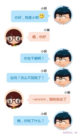 大家有没有感受到隔着屏幕的尴尬,那问题来了:女孩为什么不回信息?一个原因是:和你不熟,防卫心会比较重,聊天会很客气。所以,收敛点吧,你越是主动,她越觉得你有其他目的,所以得防着你。另一个原因就是:聊天的内容没有营养。你不是面试官,别问那么多琐碎的事情,女生看了估计这辈子对男生都X冷淡了。