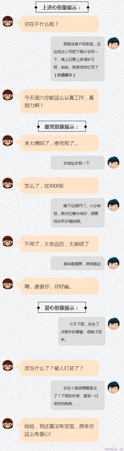认识一个女生,恨不得和这个妹子不停的聊、一直聊到晚,其实这就是一个丧失吸引力的表现。女生会感觉你这个人很无聊,没有什么正经的事情做,天天找她聊天,一种低价值的展现产生。学会控制聊天的频率,才是聊天中高价值的第一步,和妹子的聊天的节奏,一般保持2-3天就可以了。正确的聊天节奏可以让你的聊天事半功倍,具体的掌控方法在内部服务有非常详细的讲解。其次,学会挑选聊天点,不用每天找女生聊、不停从早聊到晚。