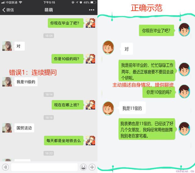 导致连续提问有两个原因:其一,有些男人遇到喜欢的女孩,想尽快投其所好,于是就开启提问模式,像猎人发现了猎物马上就收集猎捕信息。其二,试图用提问来逃避无话可说,我问你答短暂产生了聊得不亦乐乎的错觉。但实际上,连续提问是在透支社交的耐心和礼貌。正常的聊天应该是你来我往、互通有无的,你可以向别人索取信息,但也应该向别人提供信息。尽管在对话刚开始的时候人家可以出于礼节向你单方面提供一些信息,但如果你总是没有回馈,这就打破了社交的平衡,对方就会觉得跟你聊天不舒服。