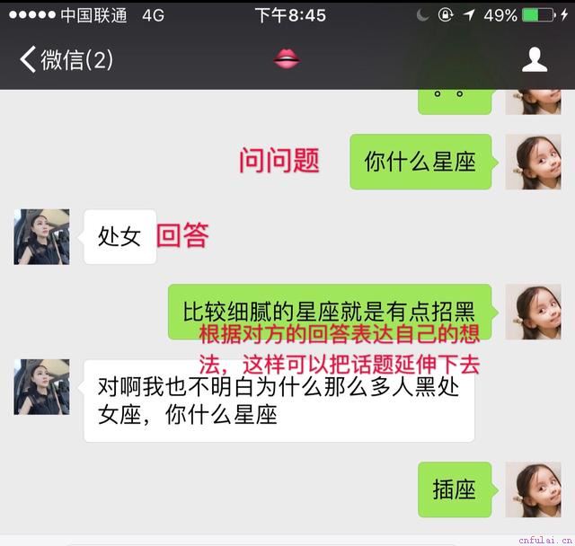 03:你知道你为什么聊着聊着就没话题了吗?因为你一直不停的问,其实每个人的话题就十个八个的,正确的聊天是先问问题,然后根据对方的答案去加入想法或者跟他开开玩笑,这样一个话题就可以聊很久!而你一直问问题的话,不到10分钟你就没话说了!(下图左边是正确的聊天方式,右边是错误的聊天方式,好好体会一下)