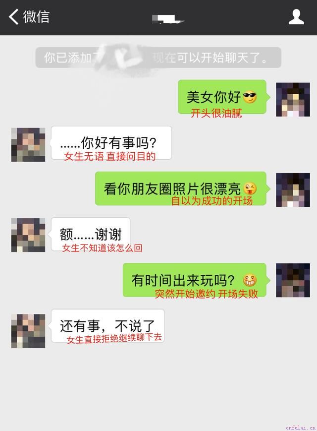 怎么样,看起来是不是很熟悉,有过这样聊天的兄弟请你现在自动去面壁三分钟,这尴尬指数都突破天际了,这样的尬聊典范可是妹子最讨厌的聊天方式排行榜上能进前三的例子!上面的图片是真实案例——学员小Q在和他喜欢的女生的开场已经十分糟糕,这样的开场白一般是当场跪,没有女孩子会喜欢只知道暴露自己的需求感和轻浮油腻的男生,女孩子遇到的夸赞太多,这样的开场只会给你的印象打上最低分。不管我们是否有足够优秀的外在条件去吸引女生,但是人都要有自己的特点,好的开场能让事情事半功倍,让女孩提升对你的兴趣,愿意跟你继续聊下去,不觉得和你聊天尴尬、无趣就是我们的目的!