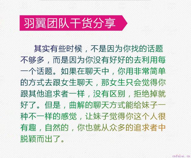 每个人都有自己的闪光点,比如设计、阅读量、情商智商、摄影技术等等。通过对她相对应的审美、理解、看法给以高度的认同,于是她在我们这里有一个虚高的价值点,而在别人那里没有。不会聊天,总是被女人拒绝,但是下定决心要学习聊天的兄弟,以及想要狙击特定女人、挽回失去的感情的兄弟,直接点击#微信#,给羽翼咨询师发跟羽哥学!
