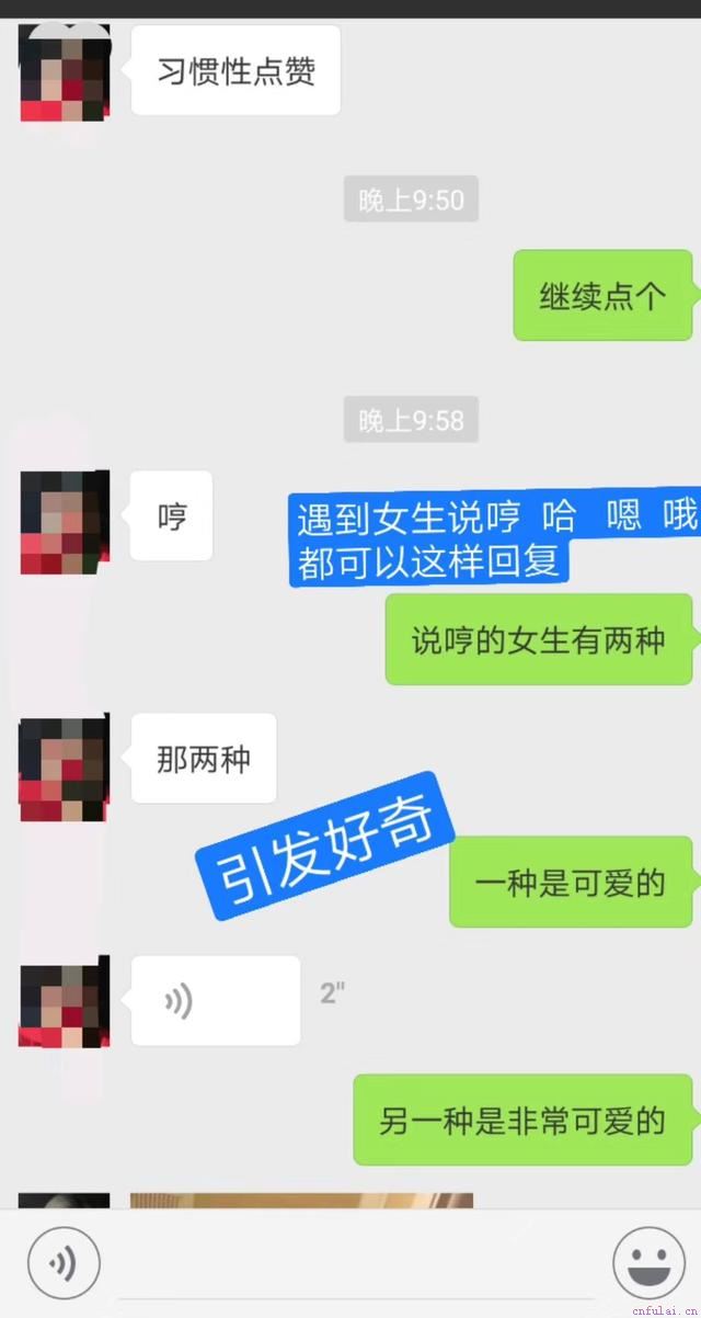 你再继续说:我也没吃呢女人只能回你:哦因为她不会去想怎么回你,也不知道怎么回你。因为你们刚认识对方还是矜持,她说多了不好,害羞,腼腆,最好的反应也就是:你也很忙?或者:那你叫点东西吃 因为你说的每一句话,都已经给了女人设定好了答案,注定好了女人会怎么回你了。你说在干嘛你给女人设定好的答案就是:呆着躺着买东西烦呢你说:昨晚梦到你。就注定女人会问真假?梦到什么?你说了一个可笑的事,就注定女人会回你哈哈你说了一个很冷的事就注定她会回你。。。你说了一个她感兴趣的事,就是注定她也会提起兴趣跟你聊,比如说女人自己,因为女人最关心的是自己。所以不想女人回应冷淡,就要想好你说这句话,女人会怎么回复。话题你先起,起完你思考对方怎么回复。多看对方展示的东西,不明白某宝查一下什么,慢慢就丰富了自己的知识面了。不也就是话题了吗。