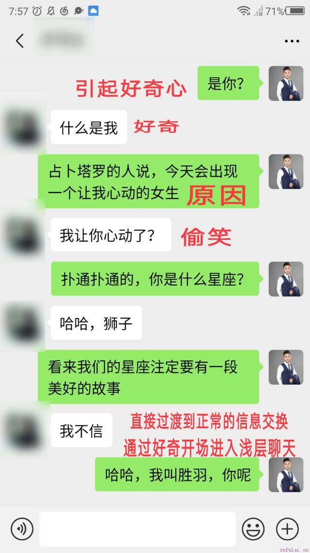 首先,说下开场白的作用:开场白是聊天的启动,让女生比较容易或者说乐意,能够接着我们开场说的话和自己聊下去。女生不会因为一个开场白说的好就喜欢上你,但是女生会因为一个好的开场白,给你好的回应,增加喜欢你的机率,我总结了一下在聊天中的4总开场白,以及1个正常认识女生的信息交换流程。