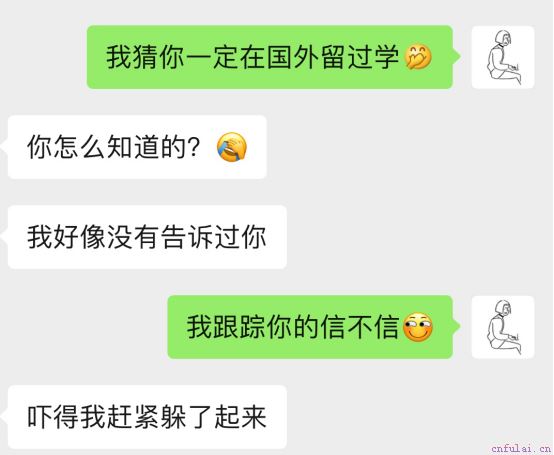 平常人都会直接的问女生:你是不是在国外留过学?女生的回复就只有是或者不是。但是用到冷读术,会发现话题变的有趣,女生给你的回复可以有很多种,她可能会回复:天呐,你该不会是查过我吧/那你知道我在哪个国家吗?/没有哦,为什么这么说?等等回答方式。
