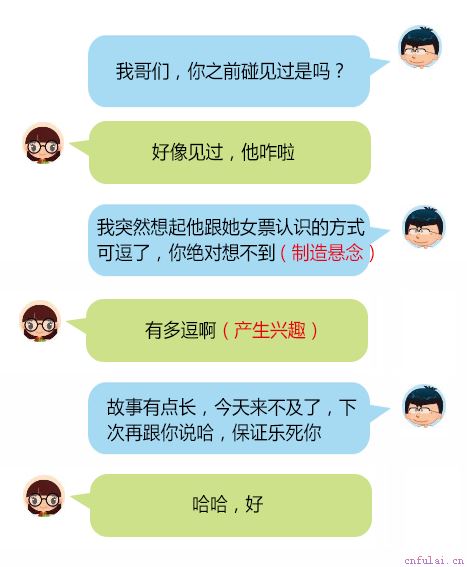 你的目的就是要勾起女生的好奇心,有了好奇心,女生就有了主动找你的借口。比如:女:你上次不是要跟我说你哥们的故事来着吗?男:哦对,这还要从xxx说起
