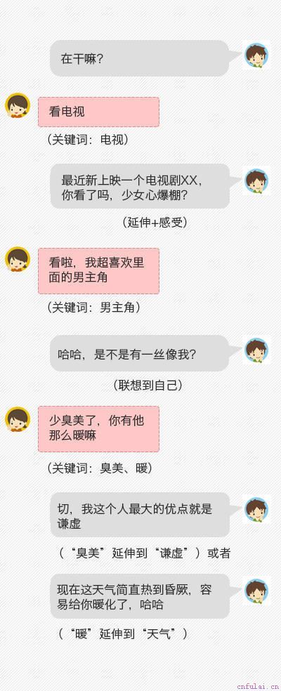 很多男生聊天喜欢上堆,刨根问底,查户口式聊天,抓住一件事聊个没完,或者指望女生给你带领话题,然后你持续的当那个话题终结者。这样都会让女生觉得无聊,和你聊天像是吃苍蝇一样难受,所以只能敷衍和不理睬你。而女生所喜欢的聊天方式是发散的,天马行空的,没有明确目的的,她们能从东家聊到西家,从天上聊到地上,甚至是化妆品的外表聊到小猫小狗……这之中最重要的就是话题的延伸能力,这里也不给你那么多复杂的操作。你只需要记住的就是:关键词摘取+延伸联想+感同身受再来看一个正确的栗子