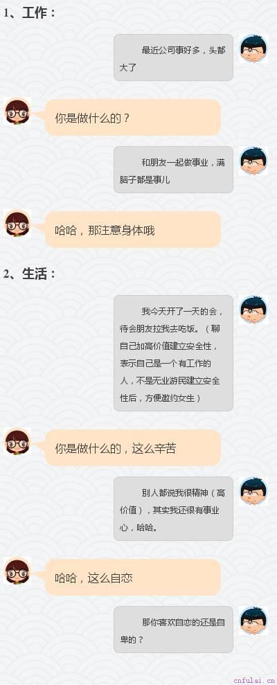 如果你很优秀,女生会欣赏你,但并不代表她一定愿意和你谈恋爱。原因很简单,你的优秀并不能引起她的兴趣。一个证券公司的精算师无疑是业界精英,但女生找他多半是谈股票,而不是谈心;倘若,他对着女生聊自己的计算原理,女孩只怕会全程低头看手机。要让女孩对你感兴趣,要想和女孩有共同话题,你需要培养一些女生感兴趣的爱好,而不是只知道恭维女孩长得漂亮之类的套话。有了共同话题,你才有机会一点点展示自己的魅力。那么问题来了,要如何与女生开启话题呢?(别着急慢慢看,重点在后面)一起看看追女孩子的聊天话题,追女孩如何聊天