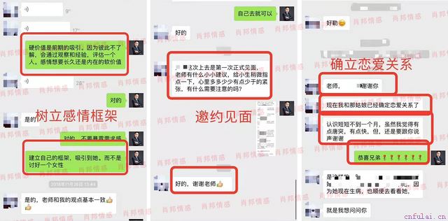 好了兄弟们,今天的重磅干货,就和兄弟们分享到这里。最后我想说的是,恋爱是可以学习的,聊天也是可以学习的,不懂就要学,不会就要问。无论学习什么行业,最快速的方法就是跟经验丰富的专业行业老师进行学习!在过去的八年时间里,已经我们已经和数千名客户委托人合作过,帮助他们完成爱的心愿,在这个过程当中,我们自己的从业经验,也在不断的积累和提高,以求全力做到精准完成客户述求!下面是部分学员的学习感悟: