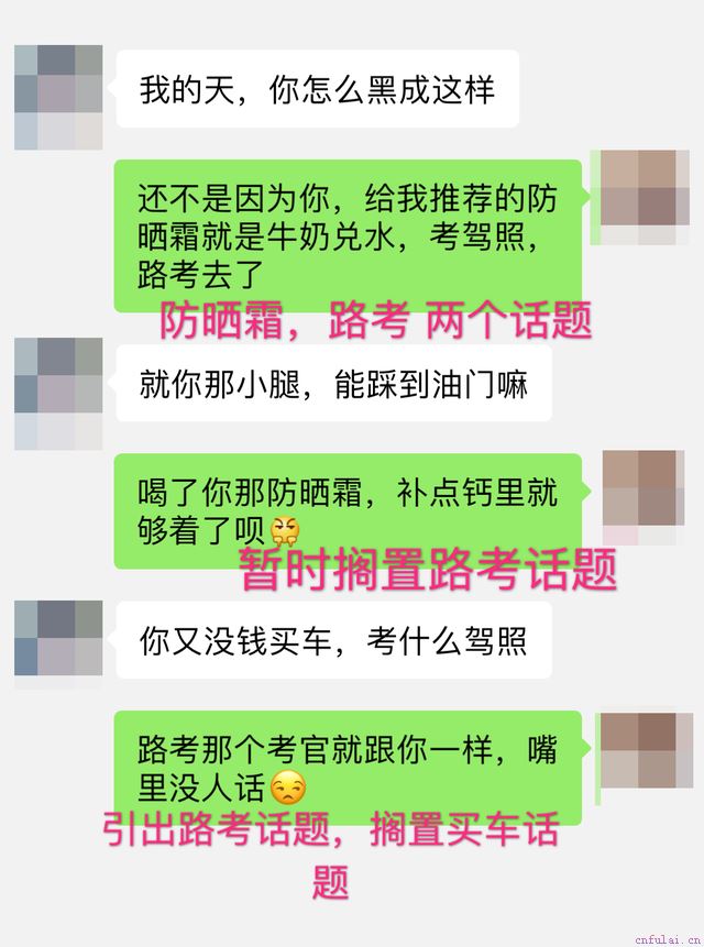 应用解读:1、面对女生发起的话题,在回答中融入两个可延展话题2、按照步骤以及女生戏说男生腿短,我们推进防晒霜的话题,暂时搁置路考的话题3、通过女生的聊天口吻,引出路考考官的话题,搁置买车以及防晒话题。
