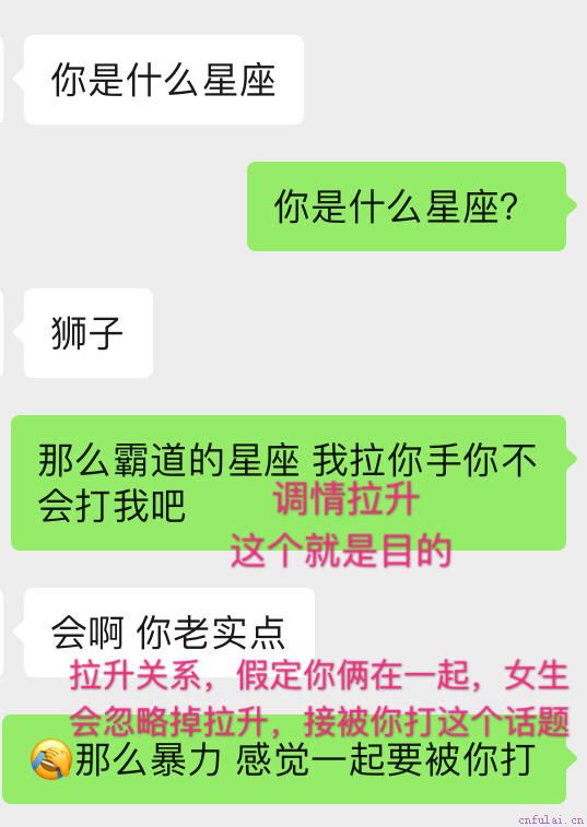 星座话题一般用于冷读女生,可以用于拉升关系和破冰(新结识女生时的尴尬期)