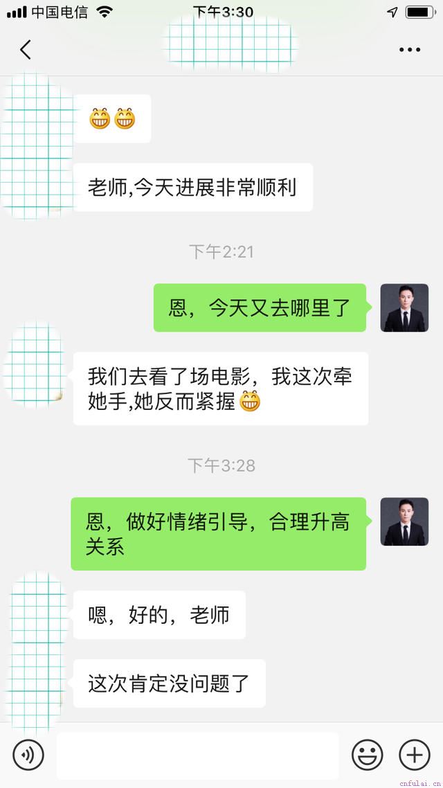 这次的偶遇,打开了两人的局面。话不多说,赶紧行动,小刘把情况汇报给老师之后,大圣老师马上开启指导聊天模式,两人聊的不亦乐乎。就这样敲定了下次的邀约。这次约会互动,大圣老师给小刘遥控指挥,肯定不能让上次的约会悲剧重演。小刘在老师那里学到的互动技巧,这个时候派上了用场。两人约在初次相遇的咖啡厅,小刘给女生讲自己小时候的故事,渐渐的女生忘记了以前的不快,她感觉这个男生如此的有魅力。互动、接触、打闹,最后一吻定情,小刘给老师发来了消息。
