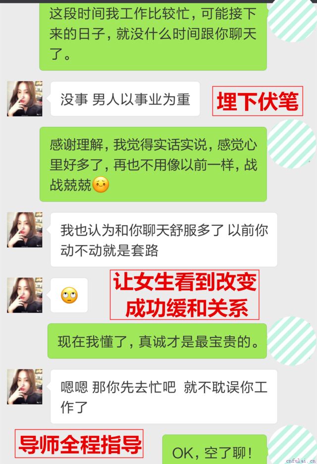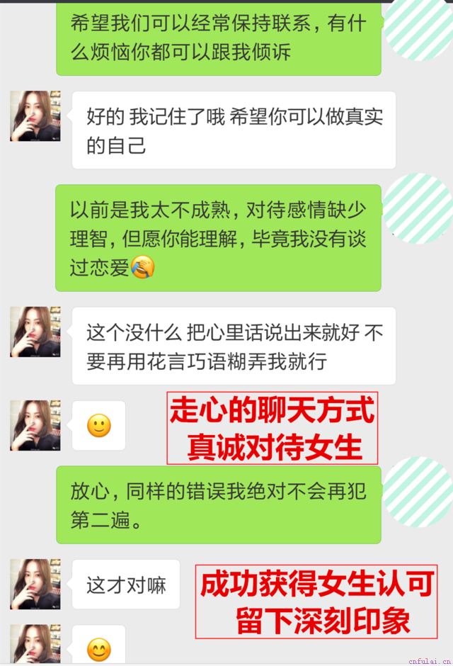学员以朋友的身份和女生聊天,女生都是非常配合,后面再加上走心的聊天话题,真诚的和女生聊天,这样就可以给女生留下深刻的印象,让女生重新给学员机会。当女生重新给你机会之后,就说明后面可以再次追求她,但是这时候千万不能着急,要不然女生会感觉你不成熟。正确的方法是:过段时间再跟女生聊天,通过几天的不联系,来给女生新的印象,同时给女生留下意犹未尽的感觉,对你产生期待。