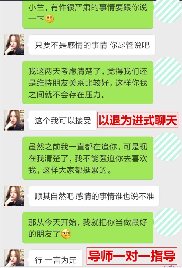 以退为进的聊天,首先肯定是要退一步,和相亲对象从朋友开始做起,这样女生就不会产生压力,女生只要没有压力,那她对你就不会那么冷淡。学员在咨询师一对一的指导下,很快就学会了以退为进的方法,相亲对象也答应了做他最好的朋友,退了一步之后,女生的回复也比之前热情了很多。接下来,就需要和女生进一步聊天,给女生留下深刻的印象: