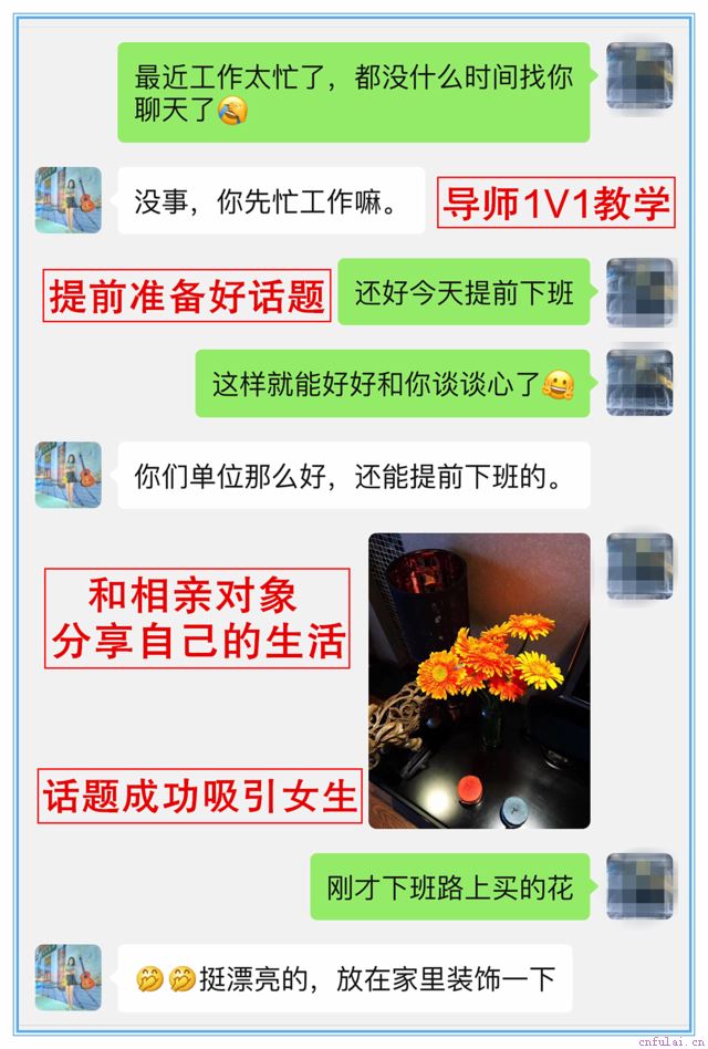 女生的每一句回复里面,都有关键词,我们只要找对关键词,就可以有新的话题,比如刚才女生说没想到你还挺细心的呢,这句回复里面的关键词就是细心,然后导师就教学员根据细心来回复女生。只要找对了关键词,那你肯定有话题可以聊,而且话题女生也会很感兴趣,大家可以举一反三,学员就是通过无限话题聊天,才和女生进一步发展的,后面只要多和女生聊天,就能培养感情,有无数个话题可以聊,追到相亲对象肯定没问题。