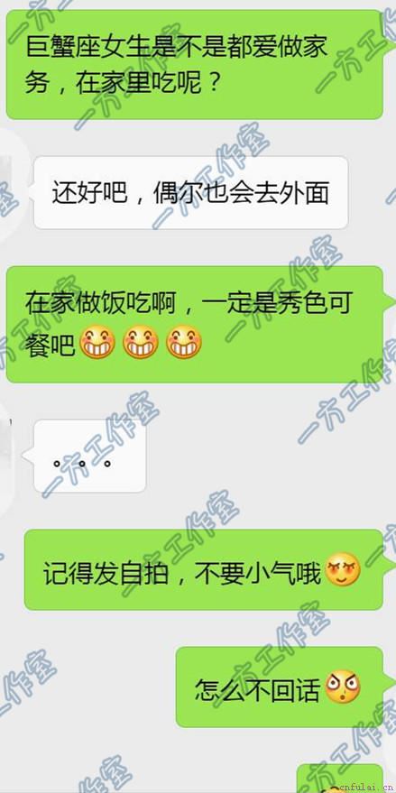 这种无意识的短择言论会立即引起巨蟹女的警惕,加大你和她的心理距离,最终导致狙击失败。另外,一定要展示成熟的一面,巨蟹女对于男人能否成为一个家庭合格的男主人非常看重,因此在聊天的过程中注意聊天话题的建设,比如聊聊家居摆设,聊聊自己工作之余收拾家务的心得等等。不要让女孩子来带话题,是你追她不是她追你好吗,而且被女神聊天带着走显得价值很低,很容易被人当成跪舔的屌丝而受到轻视,要有框架,框架!无论你多么喜欢一个人,你都要自己的独立人格,不要因为害怕失去就一位的迁就迎合。给人的感觉就是极其没有主见,不成熟,怎么会让女孩对你有安全感呢,更别提崇拜感了!