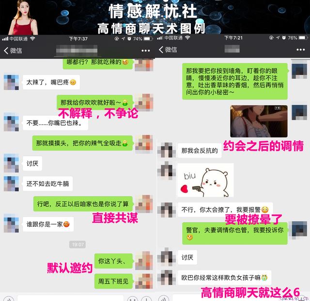 上例聊天记录多采用了分享式聊天,引导女生不断表露想法,达到加深联系感的目的暧昧期的调情:
