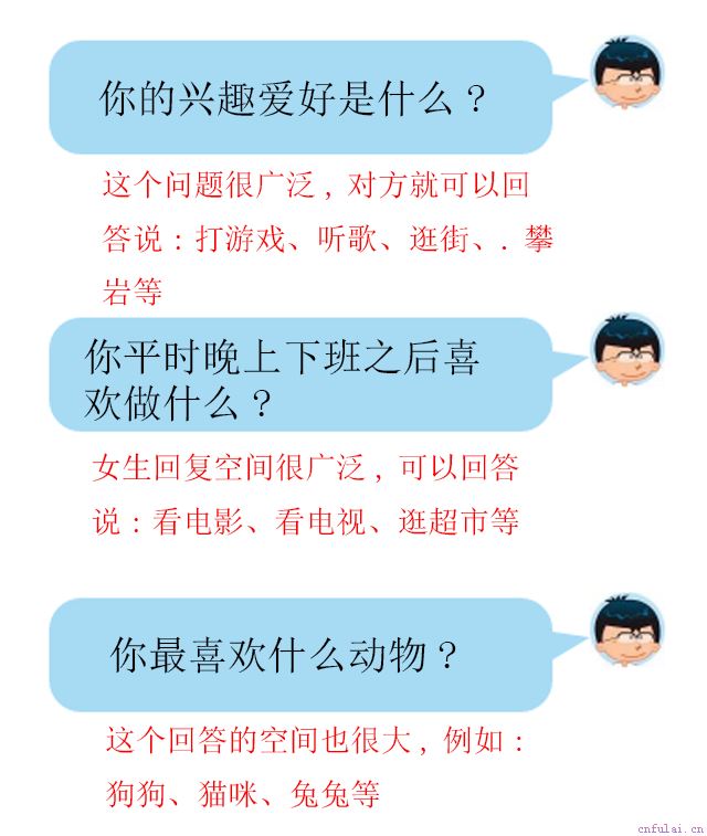 错误的提问方法:如果你问女生吃饭了吗,女生说吃了,你们的话题就这样被终结了。如果你问女生喜欢猫吗,女生说还行,你们的话题就这样被终结了。正确的提问方法: