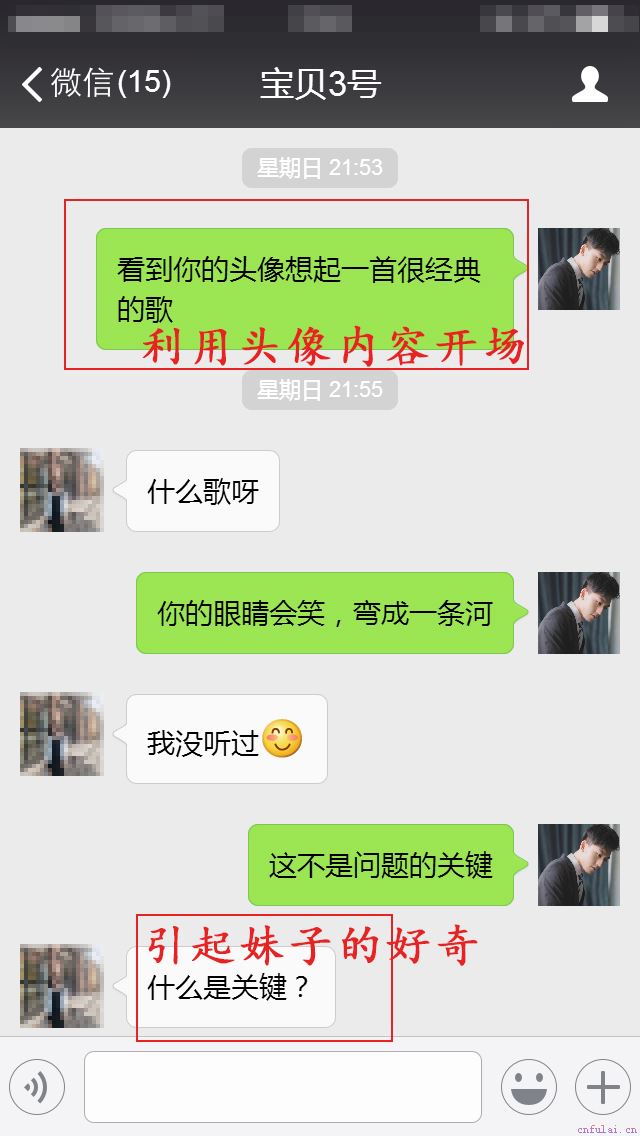 开场白最需要的是什么?当然是勾起女人的好奇心。就像这段航哥和妹子的聊天记录,航哥仅仅凭借一句话将妹子的好奇心调动了起来,她的注意力一下就被我吸引了过来。这个技巧不管你和妹子正处于什么阶段都可以使用,你可以运用这个技巧去开场,开启属于你和她的话题。