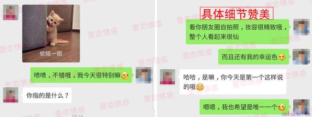 ① 具体 典型的错误是夸对方很漂亮,尤其是对于那些真的很漂亮的异性。典型的正确是具体夸异性五官中的某个点,这样才能引起异性的注意。②区别 即把她定义为一场比赛中的胜利者,比如xxx明星穿一样的衣服没有她好看。③稀有 适当的东西都是适量的,当赞美太容易得到就失去了她原有的意义。④隐性 多夸对方的隐形价值点,如有爱心、善良、独立,同时尽量避开显性价值的赞美如白、富、美、⑤双核隐藏 句式为:你应该..、我还一句赞美的话里面放两个主语。第一句赞美异性,第二句嘲笑自己的长版。