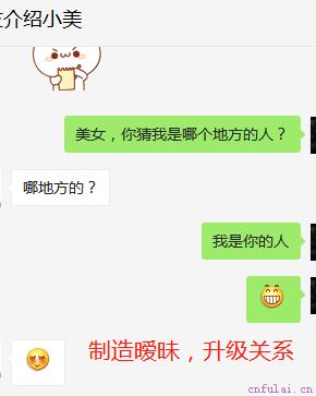 许多兄弟们在聊天的时候,和女生聊了很久,还是在最初的关系,始终升级不了你们的关系,这时候就需要调情聊天法。什么是调情聊天法,也就是制造聊天中的暧昧,引导女生暧昧铺垫+聊天话题曲解,直接击中她的心,刺激她的情绪,让她小鹿乱撞有了一定的感觉。示例:男:你猜我是哪里人?女:是哪里人?男:我是你的人。