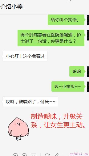 男:给你讲个笑话,有个肝病患者在医院偷喝酒,护士说了一句话,你猜是什么?女:小心肝!这个我看过男:哎~小宝贝~(制造暧昧氛围)女:哎呀,被套路了,讨厌!