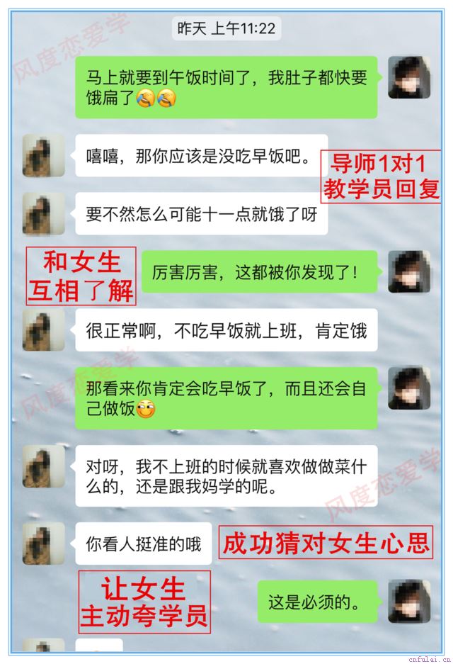 从学员的聊天记录里面,可以看到:幽默的聊天,可以马上引起女生的兴趣,只要女生对你的聊天感兴趣,那自然就会对你这个人感兴趣,这就是幽默聊天的效果。其实,这个学员之前完全不会聊天,话题都找不到,这时候导师就会手把手教他和女生聊天,指导他去聊幽默的话题,先给女生讲个笑话,让女生的心情变的开心,然后再幽默的回复女生,慢慢和女生拉近关系。聊完幽默的话题之后,学员已经成功吸引了女生,这时候再去对女生好,肯定就没问题了,导师会1对1教他去关心女生,让女生接受他: