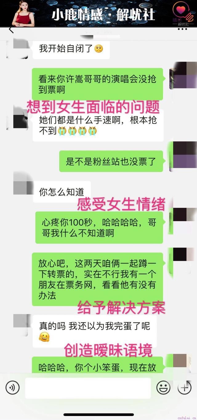心疼你100秒、我们一起蹲、小笨蛋,套用咱们的公式,安抚是为了制造情绪共鸣,解决问题是为了扭转女生此刻低落的情绪。整个过程下来,心里高兴了,并且她会认为这是你带给她的,这才是爱情中真正不可取代的东西。很多人要么是死在无法理解女生的语言中,要么是死在无法拓展女生的情绪中,更有甚者是在这两个地方来来回回的死。