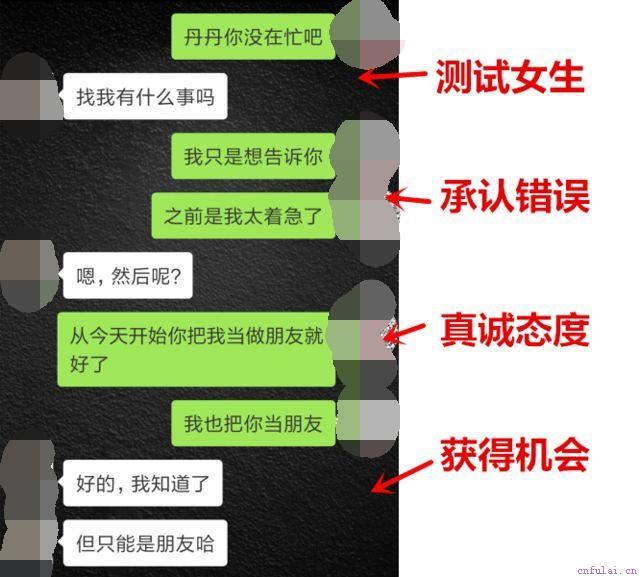 先测试女生是否有时间聊天,这点非常关键,如果,女生没有时间的话,那聊天根本没有办法进行下去,学员之前就是不会测试女生,才经常吃亏。测试出女生女生有时间,但是态度很冷淡,这很正常,于是,学员就直接跟女生坦白,承认之前的错误,这样就可以给女生真诚的印象。没有那个女生会拒绝真诚,在充满套路的社会,真诚是最好的聊天方式,然后和女生确定朋友关系,让女生减少压力,这样就不会暴露自己的目的。所以这里我们给了妹子台阶,嘴上说做朋友,利用朋友来升高关系。以退为进循序渐进。如果你跟女生聊天没有话题,表白被拒,聊天尴尬冷场,那你可以马上点击#微信#来添加我的微信,私聊回复暗号–我要学,海哥会教你如何缓和关系,吸引女生,通过聊天就能追到女神!(据说添加导师微信的兄弟,咨询后90%的人收获了爱情,挽回了爱人◔◡◔)女生虽然说明只能是朋友,其实就是给了学员机会,这就是以退为进的作用,我们接着往下看:以退为进的关键,就是要让女生知道我们要和她做朋友,不会有别的想法,这样女生才不会有顾虑和压力,从女生的回复当中可以知道她已经接受了学员。然后,教学员表明自己的态度,让女生知道心里面真实的想法,女生的反应从这里就发生了一点点转变,不再像之前一样冷淡。学员和女生的关系也已经成功缓和,不会再像之前那么尴尬,连朋友都没得做,这就是以退为进的效果,可以有效弥补之前犯得错误,重新获得机会。