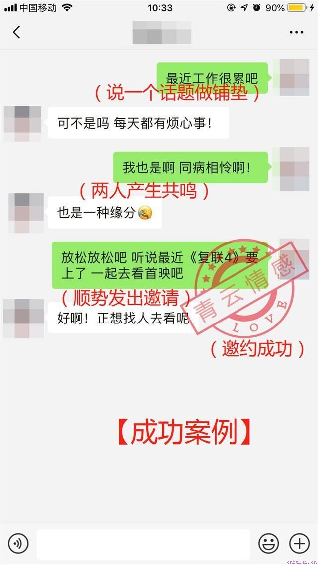 下面的例子就是我们的青云学员在学习之后的脱单成功的案例,根据这个案例我们能明白,有不懂的事情一定要问,只要你想要脱单,只要你有心,愿意努力,愿意付出,总有的一天一定会成功的,所以还在深受单身困扰,还不知道怎么解决问题的,快来联系我们,我们都会努力帮助大家解决的!