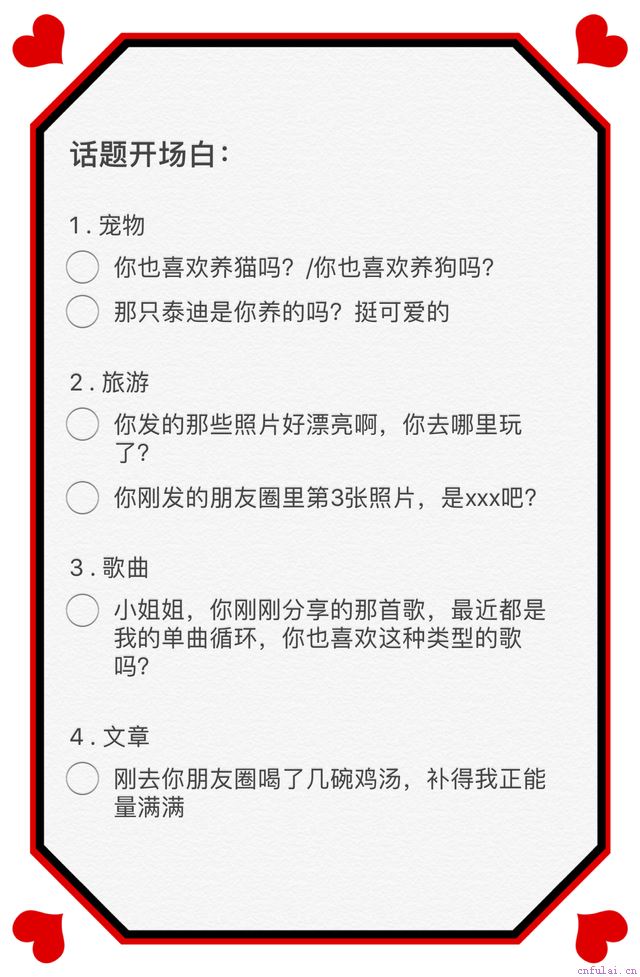 如果女生发了些小动物的照片,那么你可以跟女生用宠物的话题作为开场白;如果女生发了一些出去旅游的照片,那么你可以用旅游这个话题去做开场白,老师帮兄弟们每个话题都举了几个例子,当你遇见相同情况的时候,你就可以直接复制粘贴老师的开场白发给女生就可以了,非常简单哦。