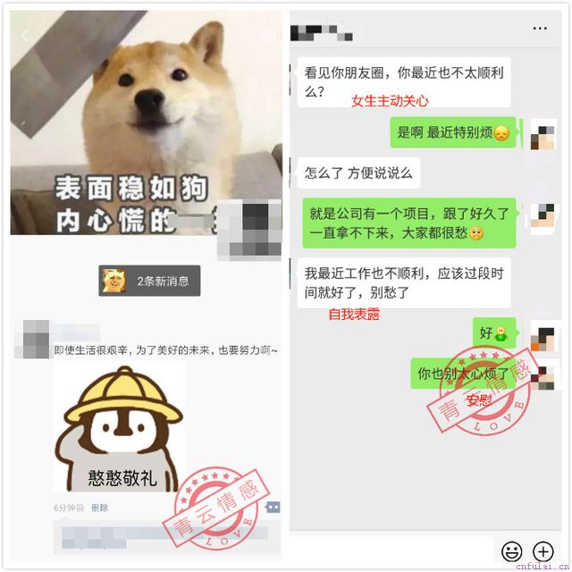 两个人是否分享过自己没有和别人说的信息,是亲密程度的重要体现。引导对方自我表露需要时机,一般情况下,人会比较容易在情绪低落的时候进行自我表露,但是需要一个机会,比如你发了朋友圈,她表示关心或表示她也同病相怜,这个时候你们彼此会互相吐露心声,你们的关系就进了一步。