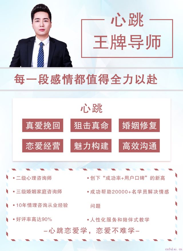 大家好,我是心跳。10年来专注于为大家解决真爱挽回,狙击真命,婚姻经营三大板块的情感问题。教大家如何通过正确的方式方法,通过实战技巧,获得真爱。截止2019年初,我们团队已经成功帮助25000+名学员解决情感问题,获得爱情真谛。包括让5652位姑娘成功和男神牵手,在情感行业被称为爱神维纳斯。